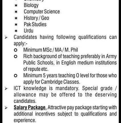 Vacancies Details of Garrison Academy Kharian Cantt Jobs 2023